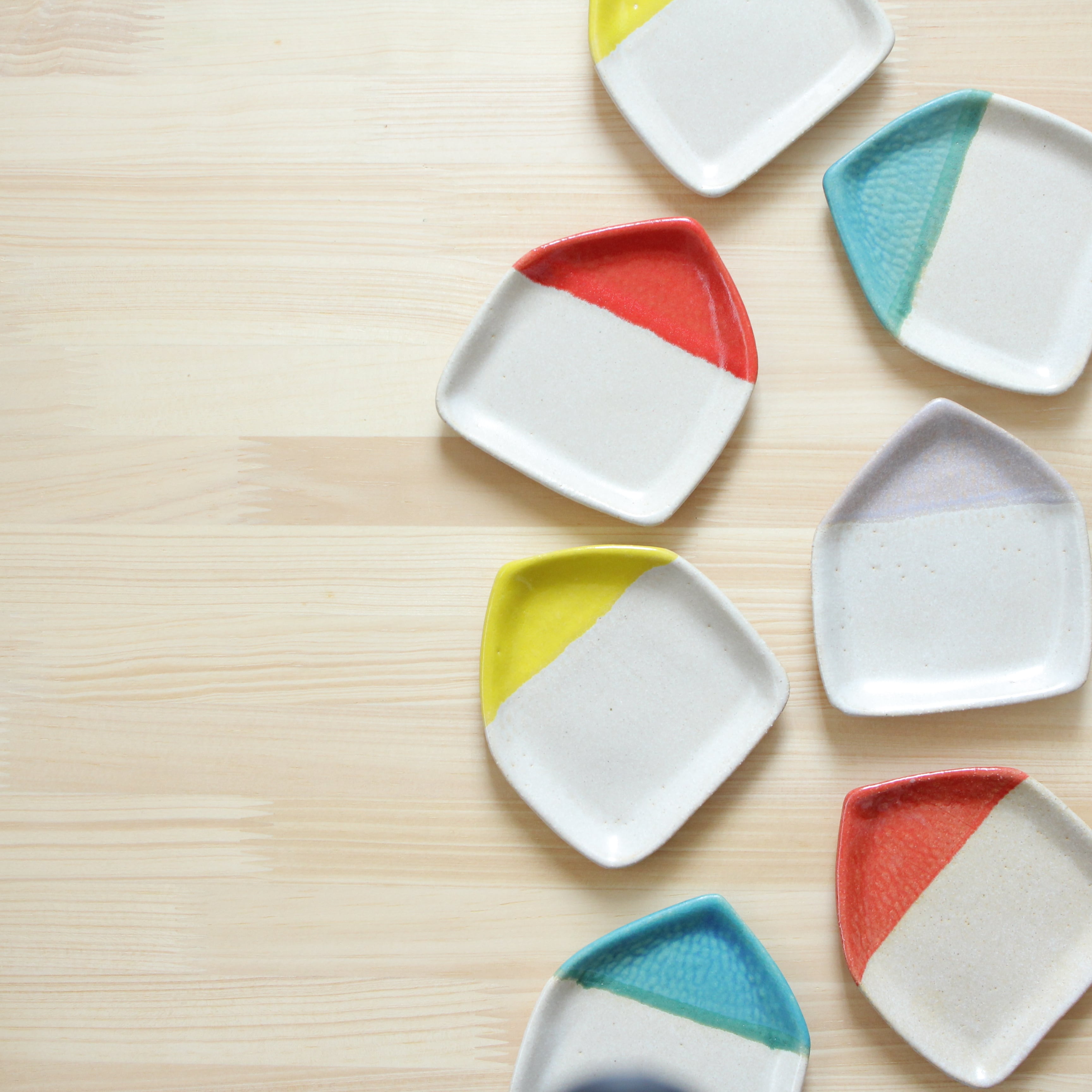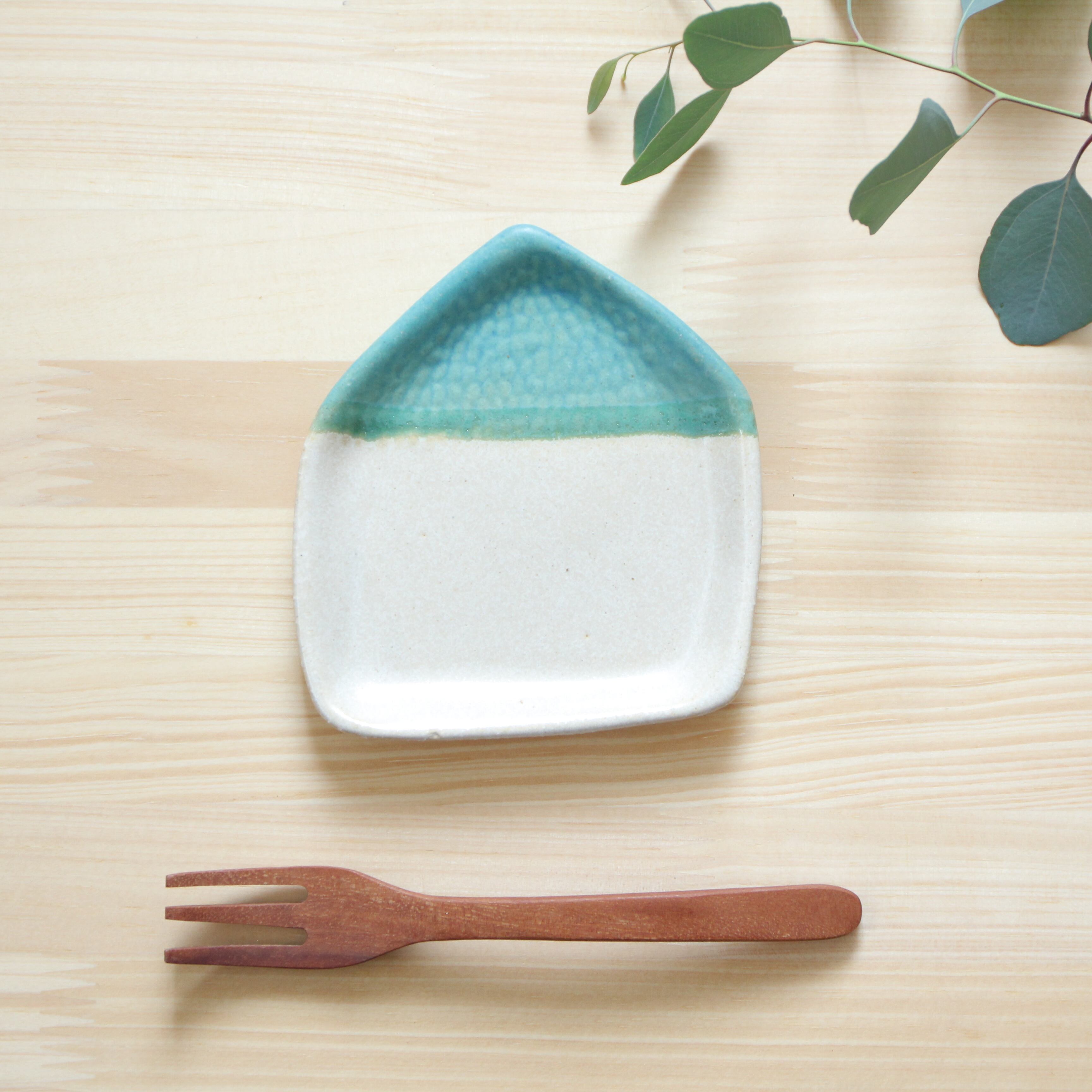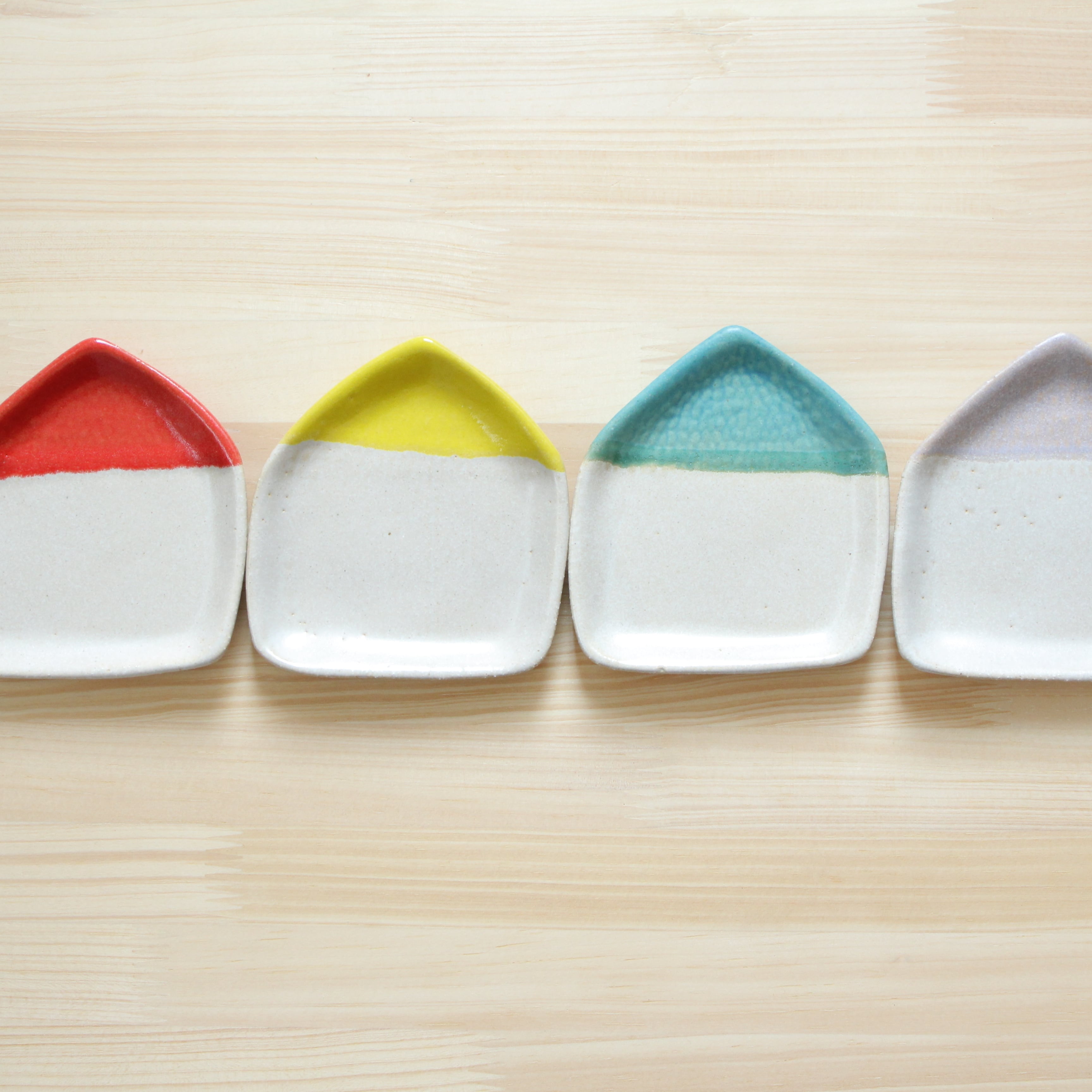 石膏型で成形し、白い釉薬とそれぞれの屋根の色を丁寧にかけ分けて仕上げました。