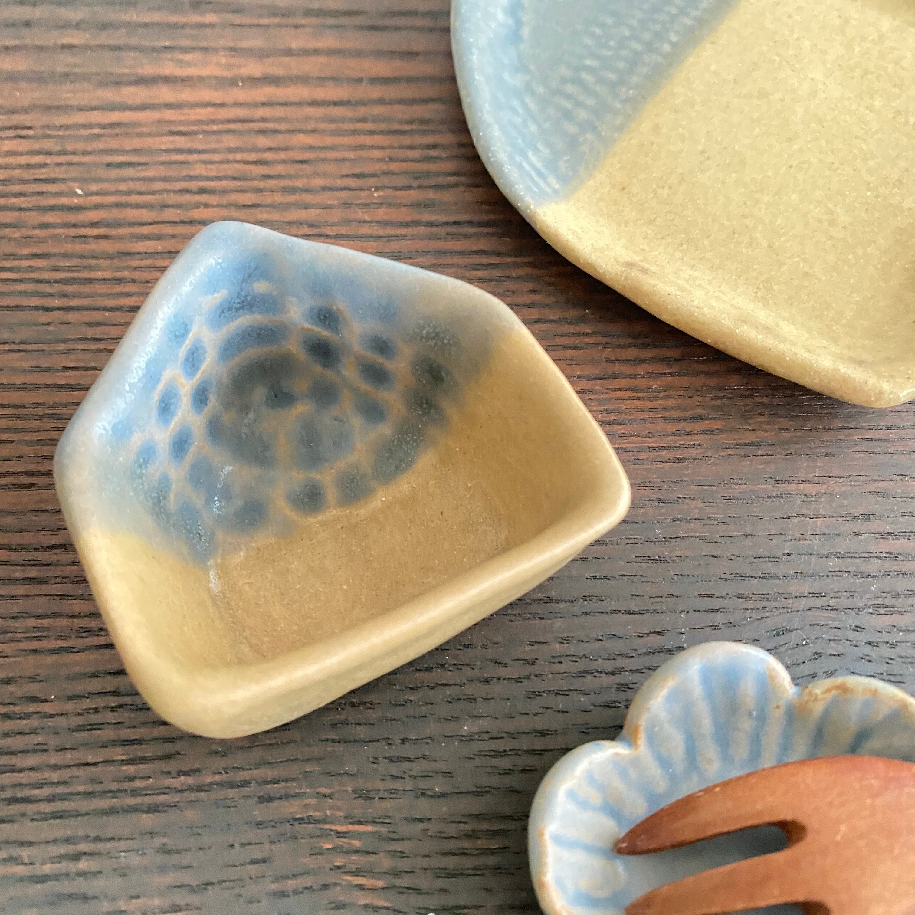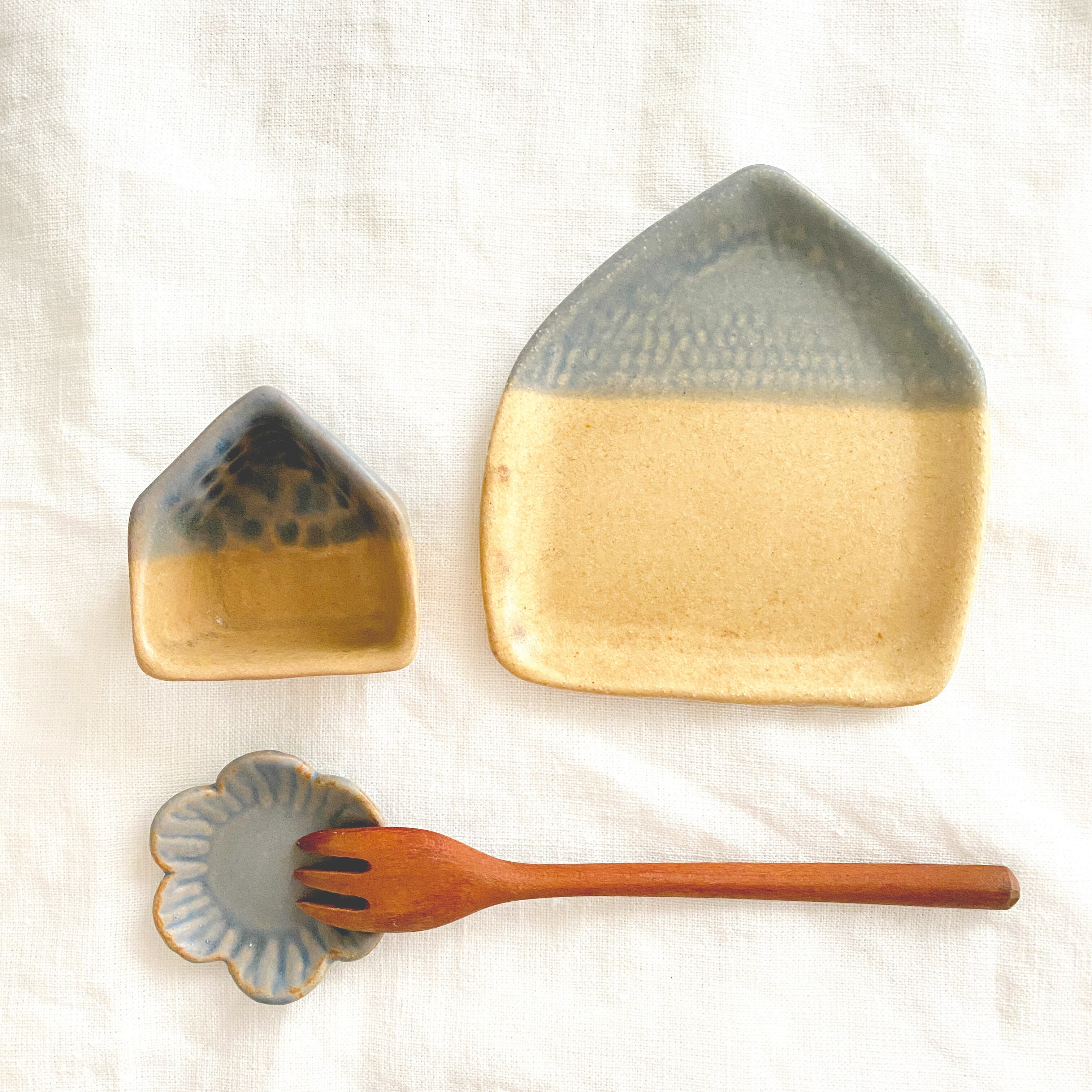 ジャムを入れるのにピッタリなサイズの、ブルーグレーの屋根のおうちの形の小鉢です。